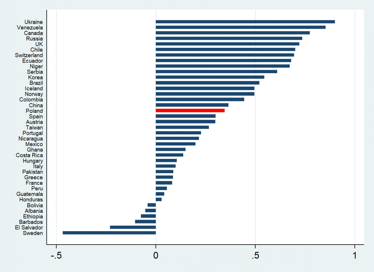 Notes: Measures of the adjusted gender wage gap obtained for migrants in the US using Ñopo (2008) decomposition. The decomposition controls for education, age, marital status and their interactions. Each horizontal bar represents a different country of origin, Poland is marked in red.