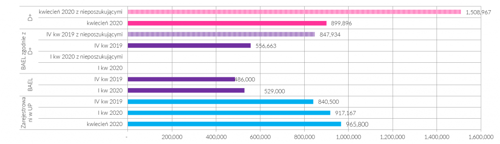 Faktyczny wzrost liczby osób bez pracy jest jednak dużo wyższy: do ok. 1.5 mln osób (z poziomu 848 tys. w IV kw. 2019 r.). W tej grupie, wymóg aktywnego poszukiwania pracy spełnia ok. 900 tys. osób. Liczba osób bezrobotnych wzrosła więc wobec okresu sprzed pandemii o ponad 60%.