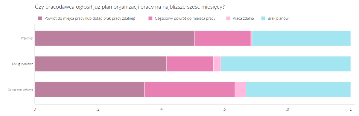 Wśród tych pracodawców, którzy ogłosili plany, przeważa koncepcja powrotu do pracy stacjonarnej. Niewielu pracodawców deklaruje całkowite przejście na pracę zdalną, natomiast popularność zuskują rozwiązania hybrydowe zakładające częściowy powrót do miejsca pracy.