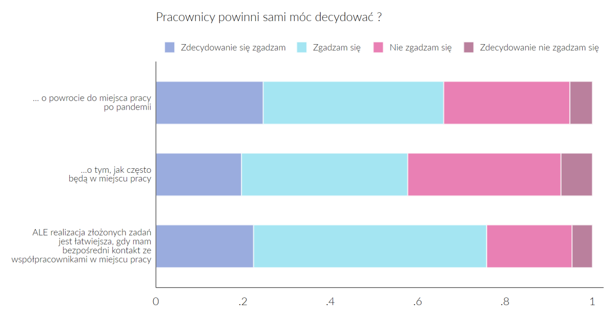 Ponad 60% osób chciałoby samodzielnie zdecydować o momencie powrotu, ale jednocześnie 45% badanych uważa, że to pracodawca powinien zadecydować o tym jak często będą mogli pracować zdalnie.