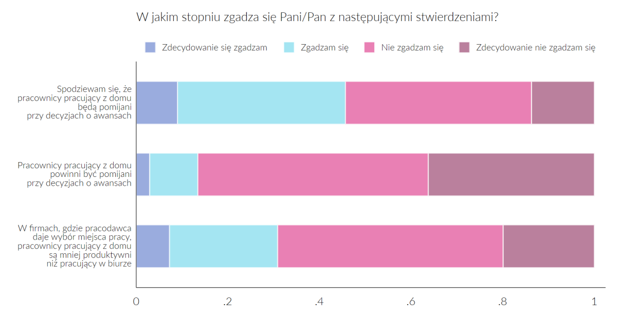 Mimo, że ponad 30% osób zgadza się z opinią, że praca zdalna wiąże się z niższą wydajnością pracowników, ponad 80% uważa, że pracownicy pracujący z domu powinni mieć takie same szanse na awans jak pracujący stacjonarnie.