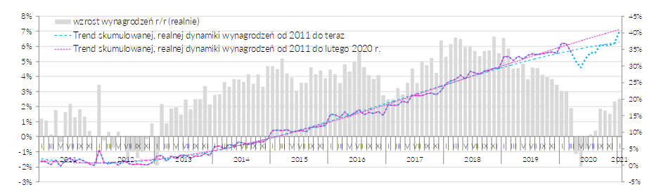 Wzrost płac w sektorze przedsiębiorstw w styczniu wskazuje na „dogonienie” przed-pandemicznego trendu. Warto jednak podkreślić, że z uwagi na zmianę próby, wzrost płac w sektorze przedsiębiorstw w styczniu jest co roku niemiarodajny dla pozostałych miesięcy.