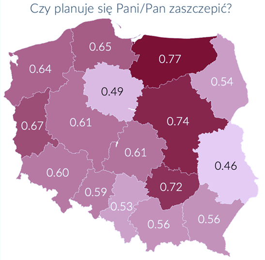 Zdecydowanie niższą skłonność do szczepień deklarują mieszkańcy województw tzw. „ściany wschodniej” oraz kujawsko-pomorskiego i Śląska.