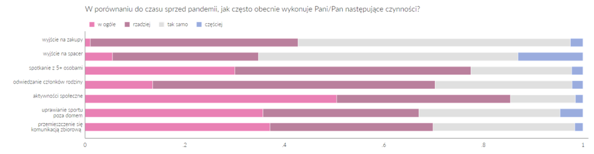 Zdecydowanie zmniejszyliśmy liczbę sytuacji, w których narażeni jesteśmy na kontakt z osobami, które potencjalnie mogą być nosicielami wirusa: zdecydowanie rzadziej przemieszczamy się komunikacją zbiorową, nie uprawiamy sportów poza domem, nie odwiedzamy przyjaciół i rodziny, nie uczestniczymy w innych formach aktywności społecznych. Rzadziej nawet chodzimy na zakupy.