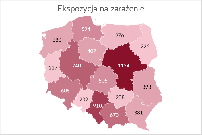 Ekspozycja na zarażenie związana jest z wykonywanym zawodem. Na podstawie badań oszacowaliśmy liczbę pracowników (w tysiącach osób) w poszczególnych województwach, które na wczesnym etapie epidemii (przed wprowadzeniem restrykcji) miały wysokie ryzyko kontaktu w pracy z dużą liczbą nieprzebadanych osób. W poszczególnych województwach te liczby wahają się od ok. 200 tys. osób na Podlasiu i Opolszczyźnie do ponad 1.1 mln osób ma Mazowszu. Należy przy tym dodać, że przeciętnie w Polsce ekspozycja na zarażenie w pracy jest znacznie niższa niż np. we Włoszech, Francji, czy nawet w Niemczech, ze względu na odmienną strukturę zatrudnienia według zawodów oraz niższą częstotliwość kontaktów społecznych w pracy w naszym kraju.