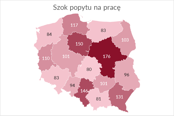Negatywny impuls związany z ze spadkiem krajowego popytu oraz eksportu oszacowaliśmy na podstawie sektorowej struktury zatrudnienia w poszczególnych województwach (z wykorzystaniem tzw. tabeli przepływów międzygałęziowych). Liczba miejsc pracy dotkniętych spowolnieniem gospodarczym w Polsce i u naszych partnerów handlowych waha się od 40-50 tys. w woj. opolskim i świętokrzyskim do ponad 200 tys. w mazowieckim i śląskim. §Przyrost liczby osób bezrobotnych zarejestrowanych w urzędach pracy na poziomie ok. 100 tys. od lutego 2020 r. (tj. okresu sprzed pandemii) to zatem zaledwie przedsmak dostosowań na rynku pracy.