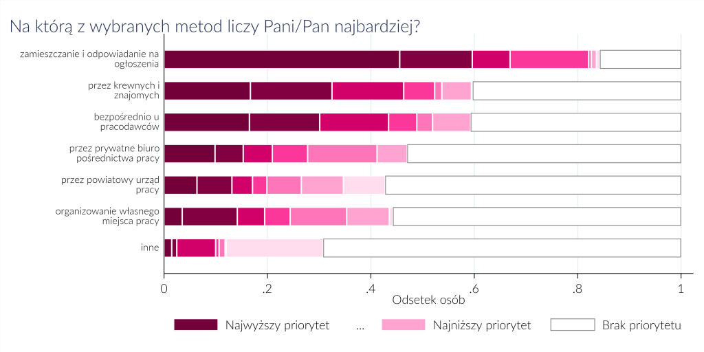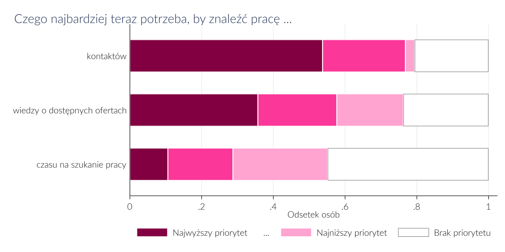 Pomimo bezprecedensowego charakteru pandemii, niewiele zmieniło się w sposobach poszukiwania pracy, jak i w pożądanych charakterystykach nowej pracy. Wśród poszukujących pracy dominuje przekonanie, że najważniejsze dla znalezienia nowej pracy są kontakty osobiste. Niewiele ponad 10% respondentów za kluczową uważa wiedzę o dostępnych ofertach. Dla kobiet istotnym ograniczeniem jest brak czasu na poszukiwanie pracy.