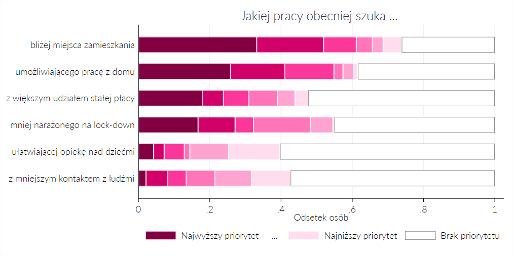 Jeśli chodzi o cechy miejsca pracy, najwyższy priorytet ma odległość od miejsca zamieszkania oraz możliwość pracy z domu. W porównaniu do Europejczyków, Polacy poświęcają dużo czasu na dojazdy do pracy, co utrudnia także pełnienie funkcji opiekuńczych. Pandemia nie odcisnęła wielkiego piętna na preferencje co cech miejsca pracy: ryzyko powtórnego zamrożenia gospodarki oraz ew. narażenie na kontakt z dużą liczbą nieprzebadanych osób nie są traktowane obecnie priorytetowo.