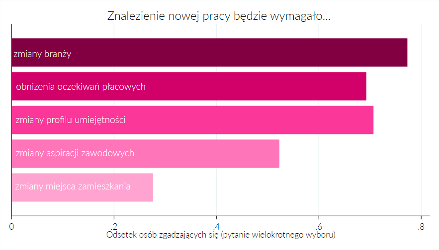 Wśród osób poszukujących pracy, bieżąca sytuacja na rynku pracy wywołuje silne reakcje: zaskakująco wysoki odsetek uczestników badania jest przekonany, że konieczna będzie zmiana branży, zawodu, aspiracji oraz obniżenie oczekiwań płacowych.