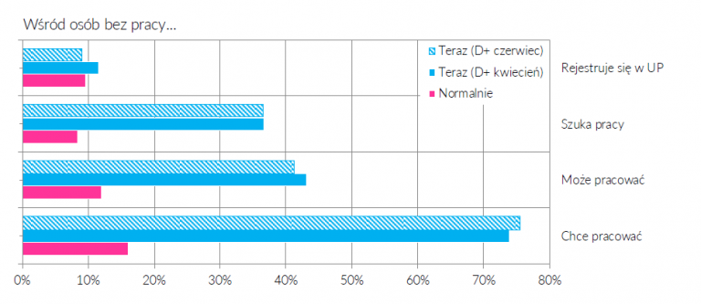 Osoby bez pracy w okresie pandemii znacznie bardziej angażują się w poszukiwanie pracy w porównaniu do osób bez pracy w normalnych czasach. W badaniu D+ ponad 35% osób bez pracy aktywnie jej poszukuje (normalnie ok. 8% osób). Co więcej, spośród osób bez pracy aż 75% chciałoby pracować (normalnie ok. 15% osób). Odsetki te nie uległy praktycznie zmianie między kwietniem a czerwcem.