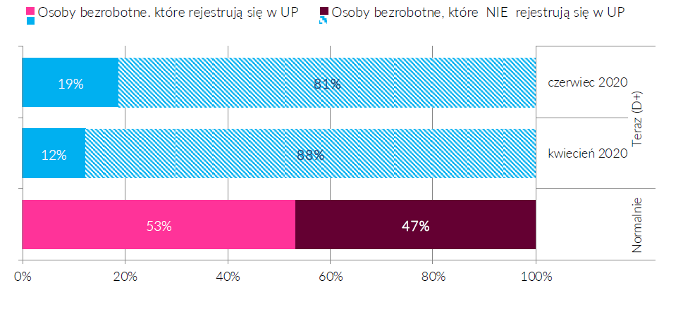W kwietniu w urzędach pracy zarejestrowanych było zaledwie ok. 12% osób zidentyfikowanych jako bezrobotne według badania D+ (ok. 9% osób bez pracy). W czerwcu odsetek ten wzrósł do 19%. Niewielkie zainteresowanie wsparciem urzędów pracy przejawiają osoby nieaktywne. W normalnych czasach, około połowa osób bezrobotnych (ok. 8% osób bez pracy) rejestruje się w urzędach pracy.